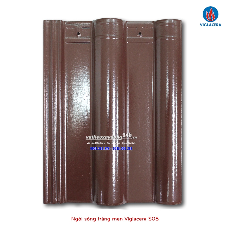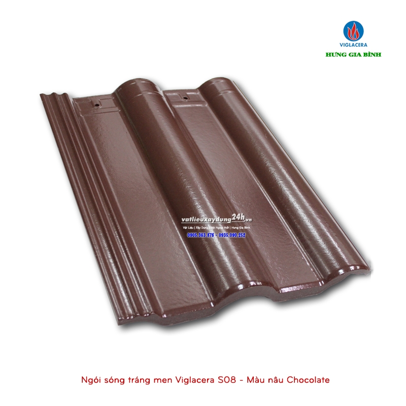 - Ngói sóng tráng men Viglacera S08 nâu chocolate được lược bỏ "yếu điểm" của mẫu cũ ngói S là không vát cạnh, giúp cho viên ngói tuyệt đối không xuyên nước, chống nóng, chống ồn được tốt hơn.